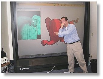 Yep, this is Amapi 6.1 running and this is me in front of a giant screen called Fakespace display. It's usually used for virtual reality systems, with data capture and gloves, exotic input devices and stereoscopic goggles. It's absolutely fantastic when you run AMIRA on it. But on this day my colleagues at TGS were done doing their Open-Inventor based testing and scientific visualizations. So I just had to run a few programs on it to see how it feels to have a larger than life elephant in the room.
