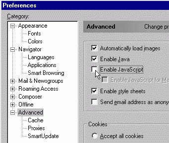 ![]() Use "Edit...Preferences" in Netscape to verify the Java settings. |
